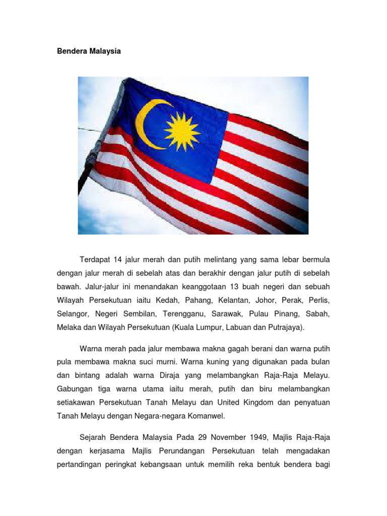 Menggambarkan Bendera Malaysia yang mempunyai 14 jalur merah dan putih. Mengenal maksud bendera Malaysia Other contents. Persidangan Majlis Raja-Raja telah perkenankan reka bentuk bendera Malaysia hendaklah mengikut reka bentuk Bendera Persekutuan Tanah Melayu.